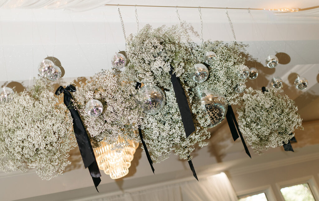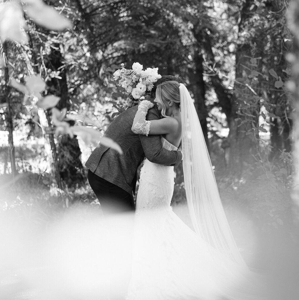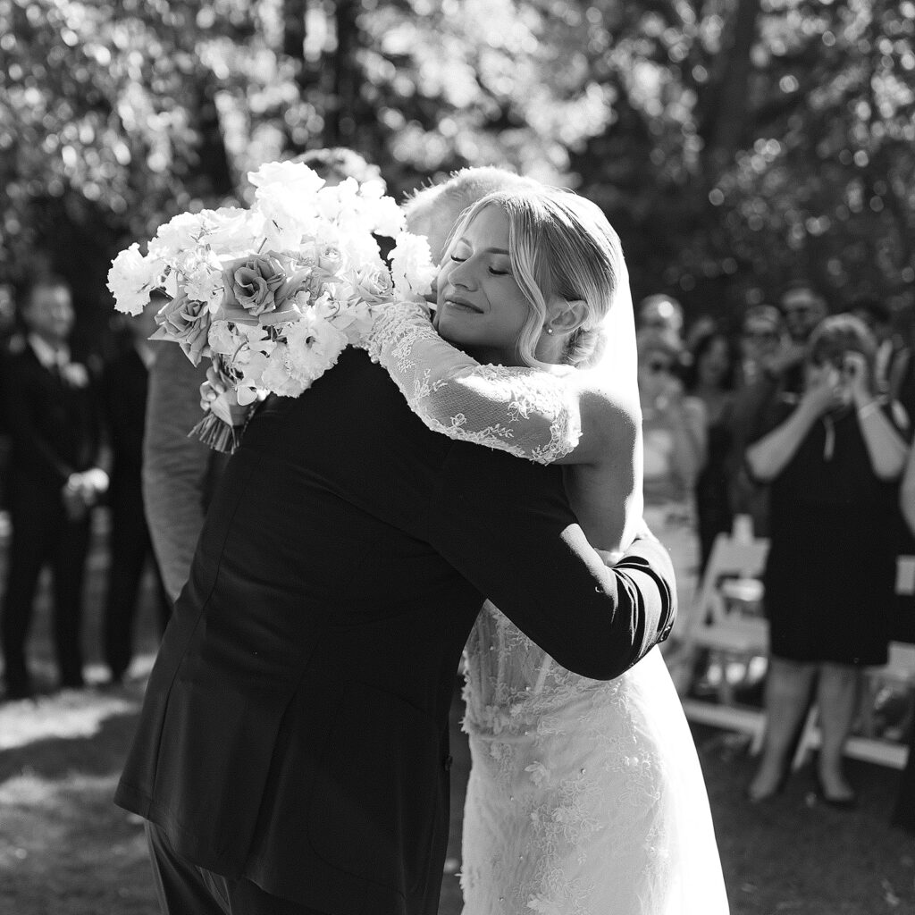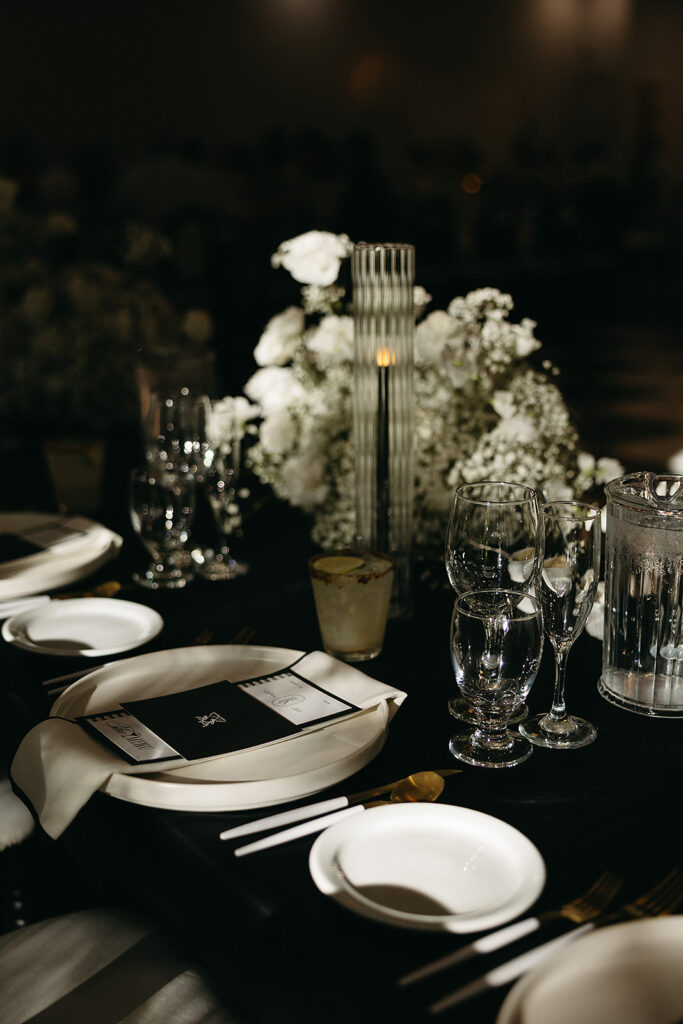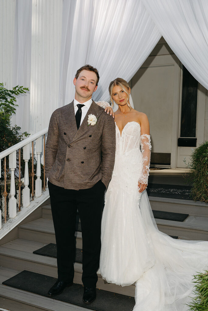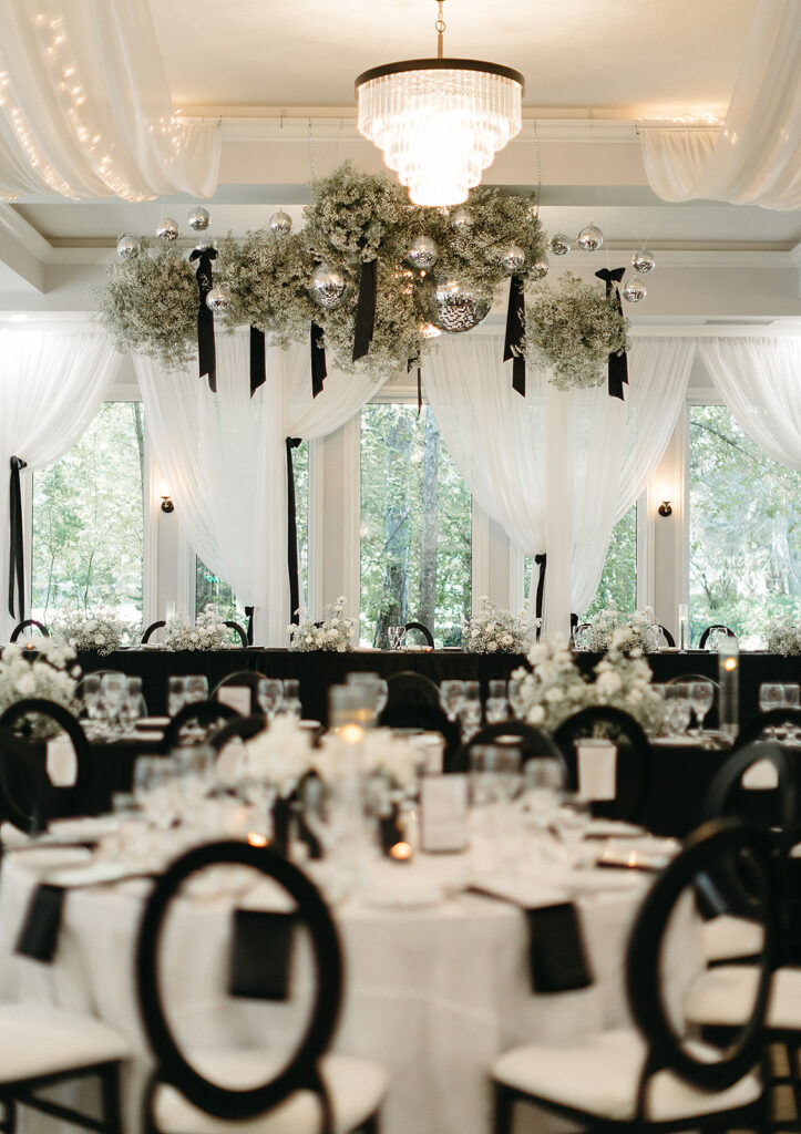 Kat wore an Alena Leena gown, timeless and understated, allowing the emotion of the day to take center stage. Florals by With the Flowers softened Norland Estate with white blooms and texture, while black and white tablescapes and chandeliers brought a sense of modern restraint to the reception.