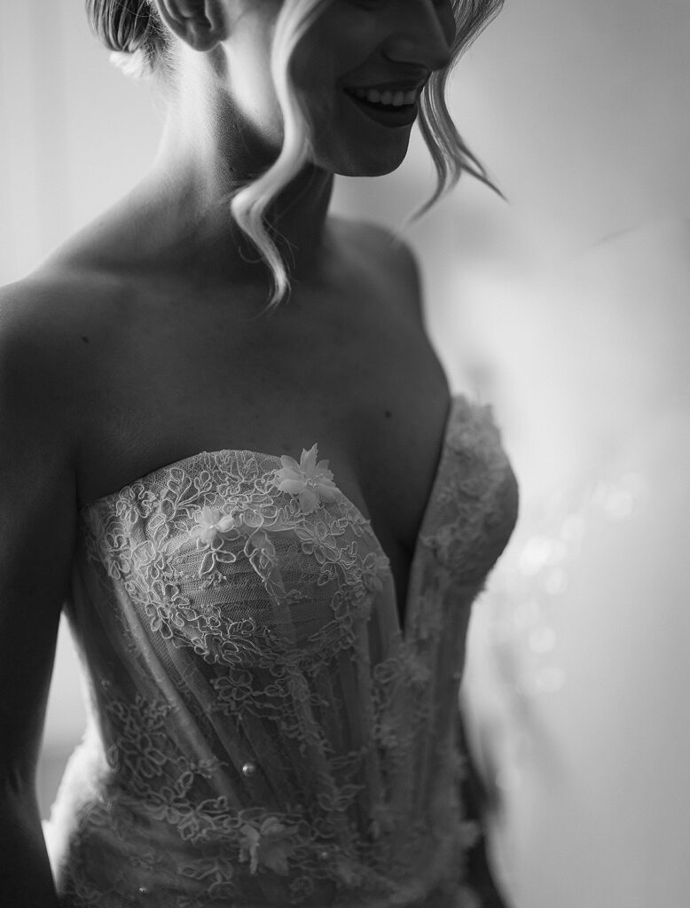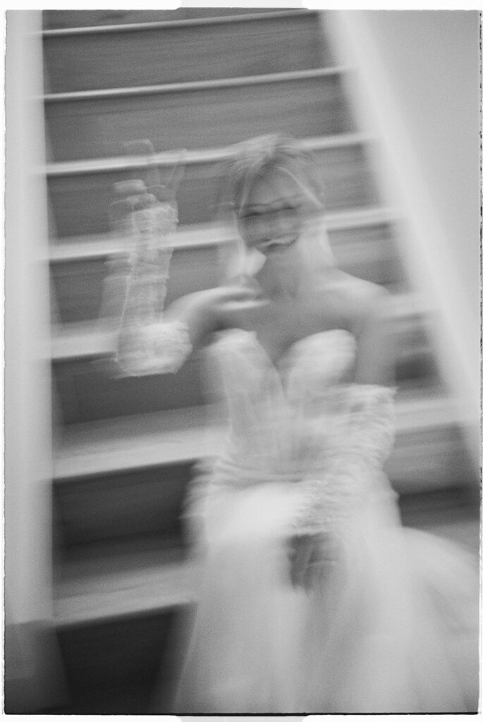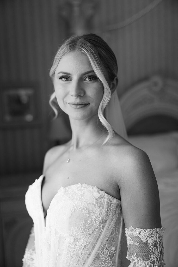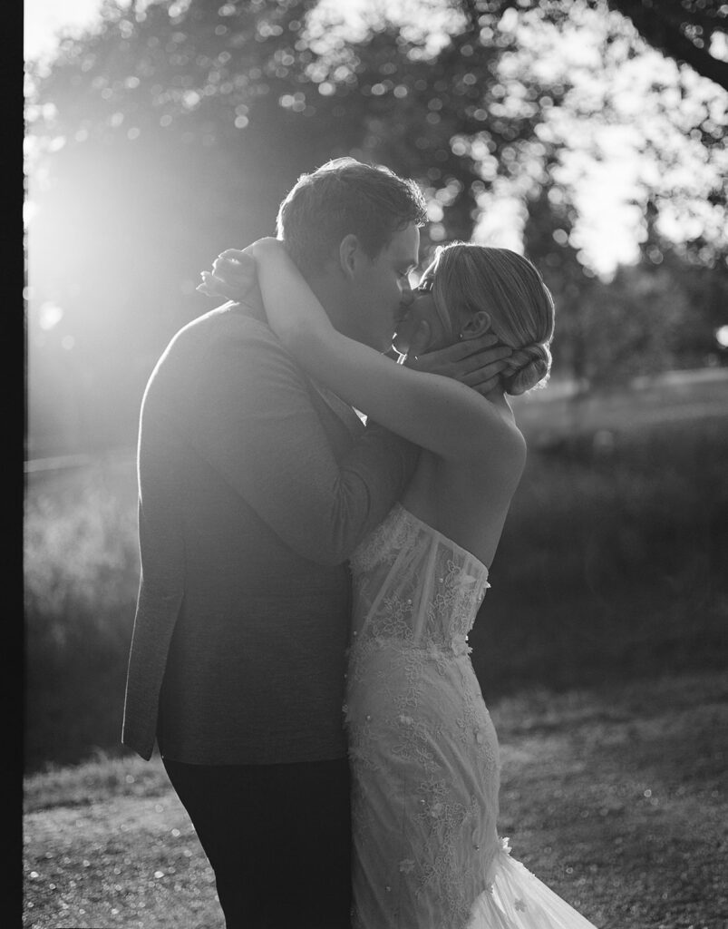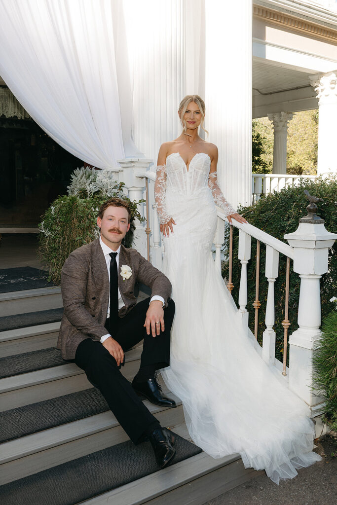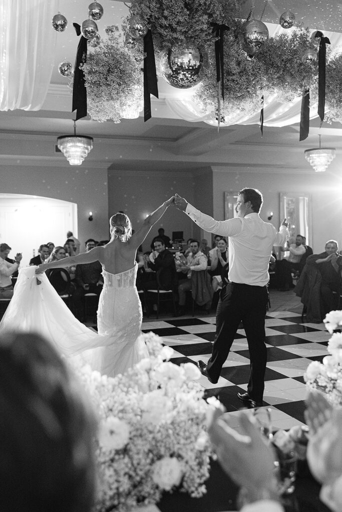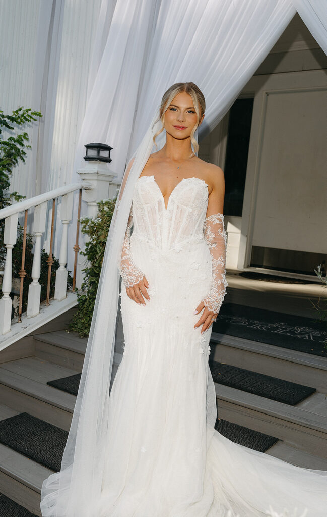 Kat wore an Alena Leena gown, timeless and understated, allowing the emotion of the day to take center stage. Florals by With the Flowers softened Norland Estate with white blooms and texture, while black and white tablescapes and chandeliers brought a sense of modern restraint to the reception.