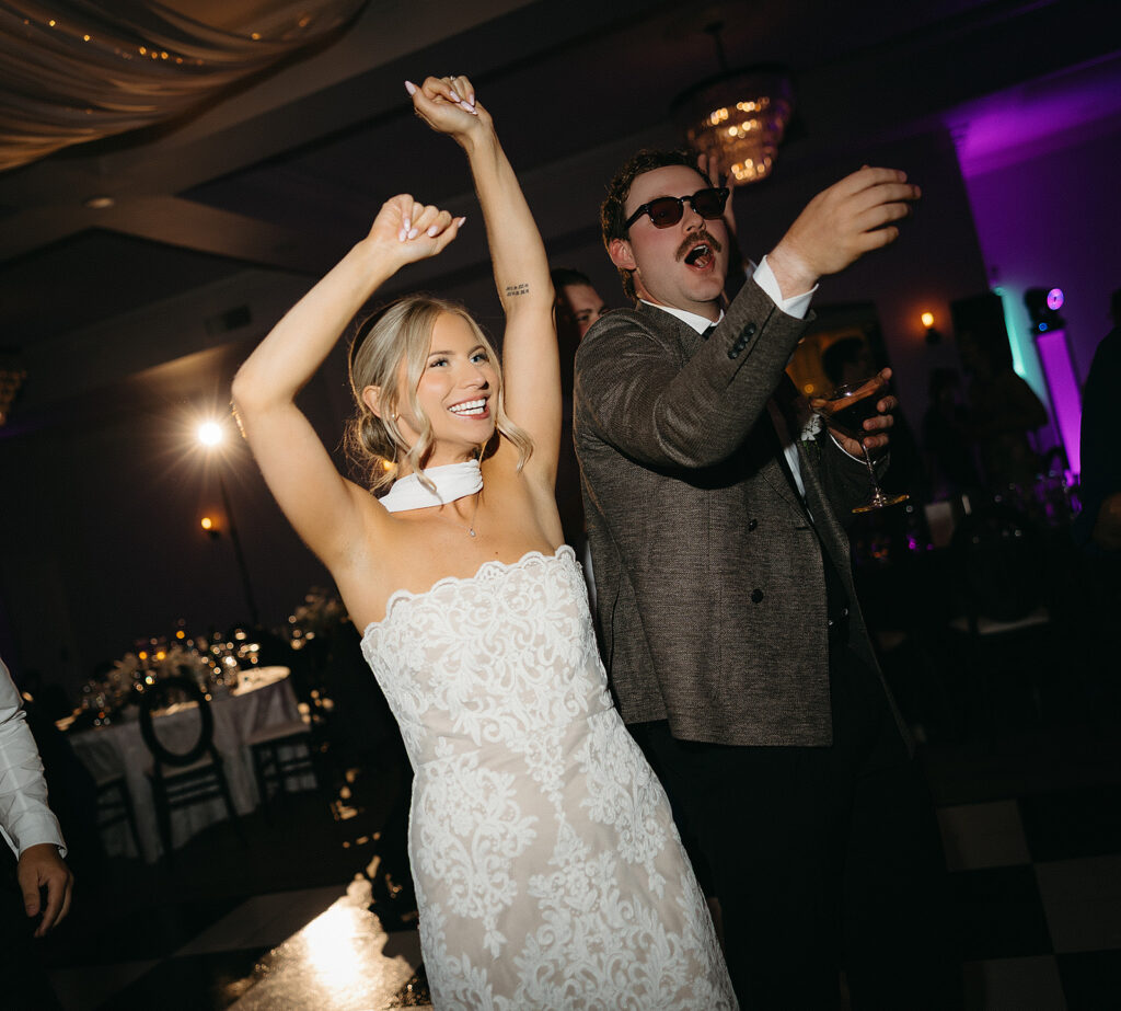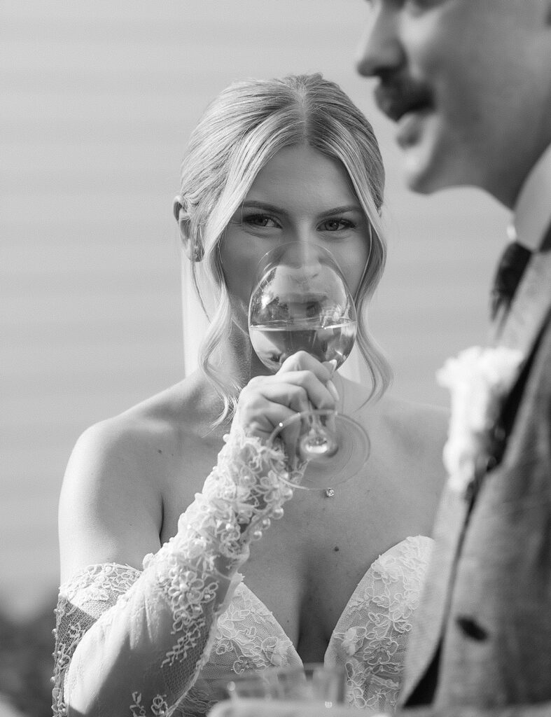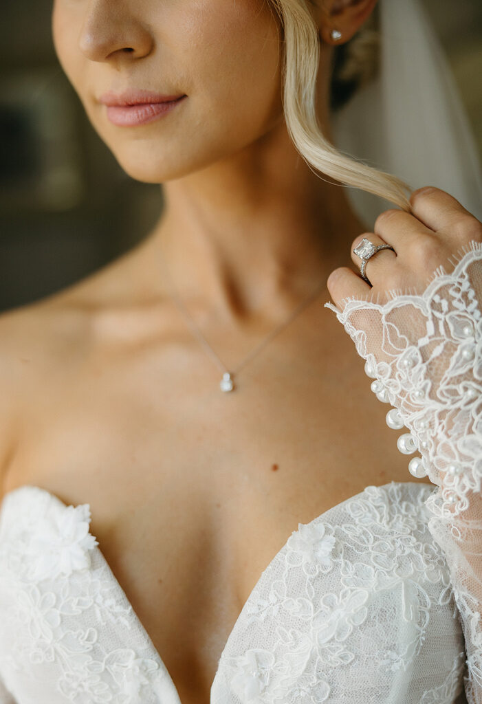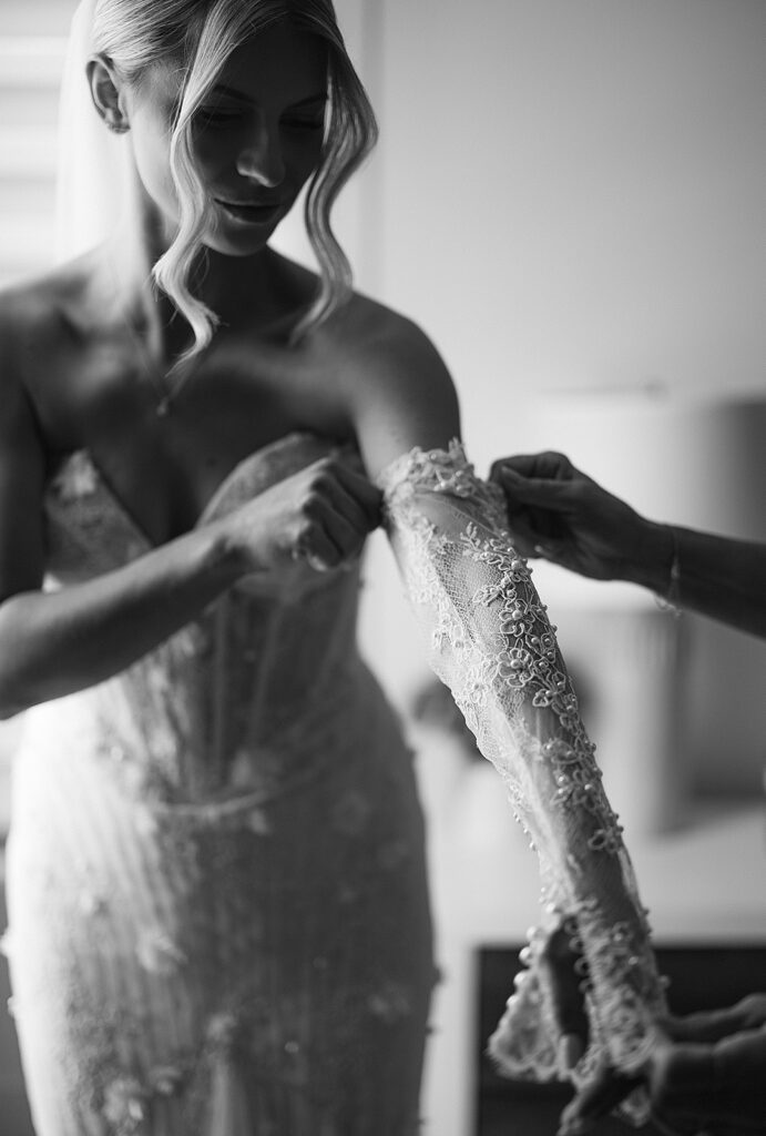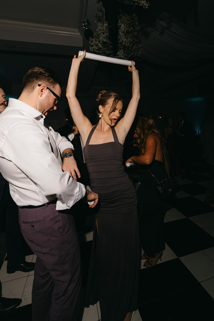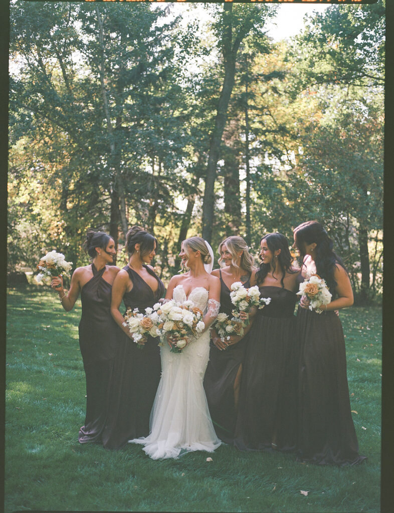 Kat wore an Alena Leena gown, timeless and understated, allowing the emotion of the day to take center stage. Florals by With the Flowers softened Norland Estate with white blooms and texture, while black and white tablescapes and chandeliers brought a sense of modern restraint to the reception.