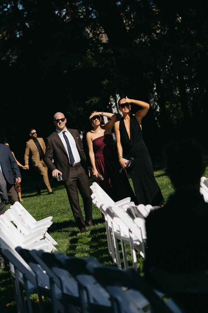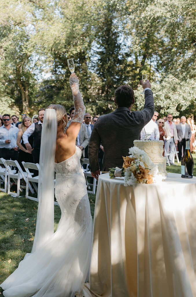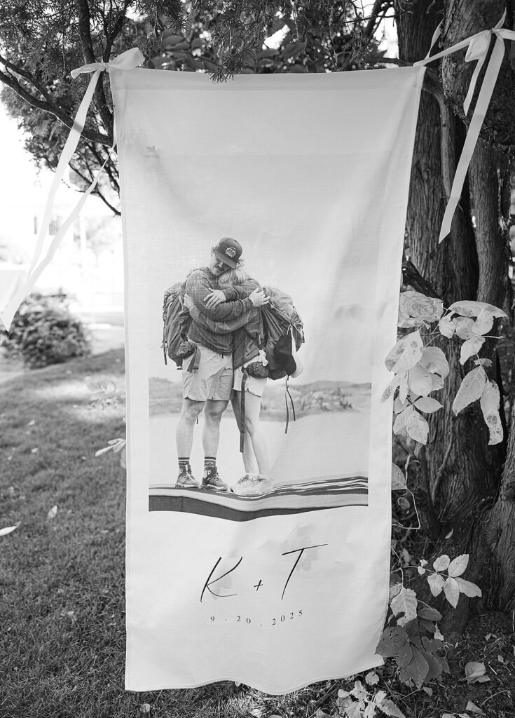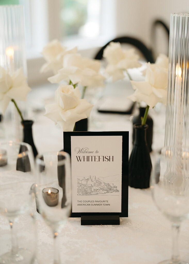 Planned and styled by Nicole Louise Couture Events, the celebration unfolded as an experience rather than a series of moments. Subtle references to their time on The Amazing Race Canada were woven throughout the day, not as spectacle, but as storytelling. Guests were guided to their seats by flight attendants at an Amazing Race inspired escort wall. A Next Leg map mat marked the path forward. A custom wedding logo appeared again and again, grounding the design in unity.